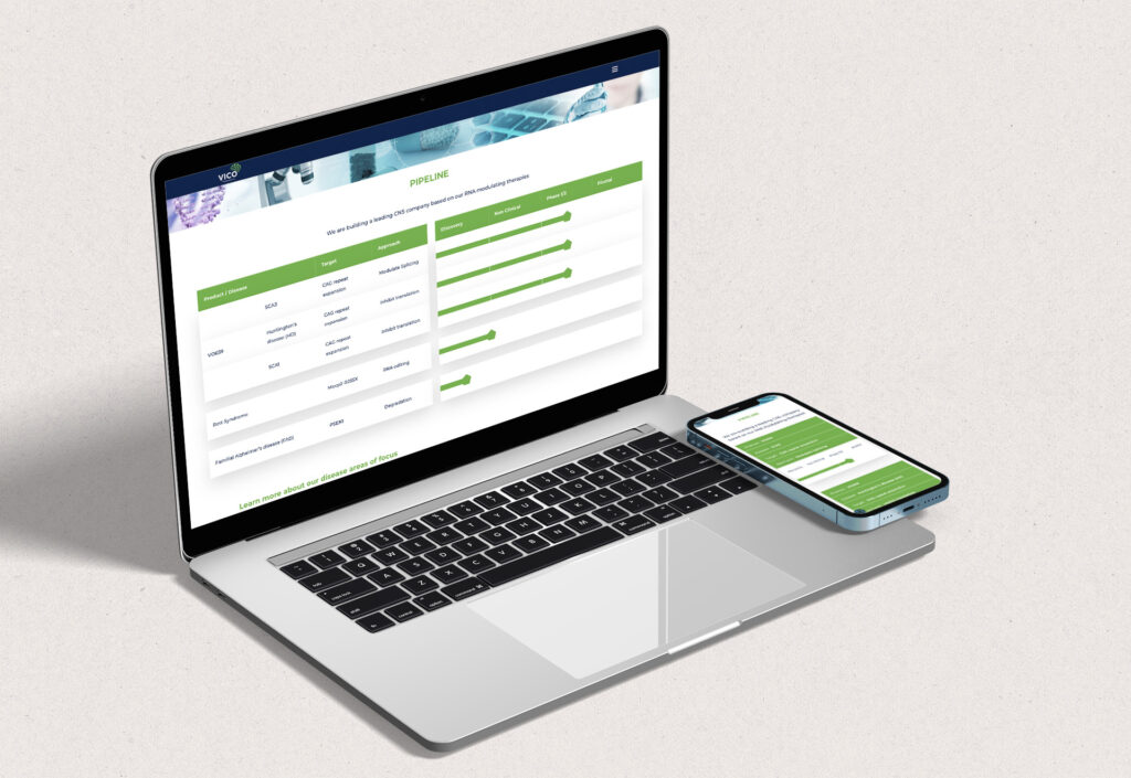 Pipelines are an important part of any biotech website. We paid extra attention to VICO’s pipeline by making it fully responsive. On desktop, their website visitors see the classic pipeline that most of us are used to. On mobile devices, this pipeline splits into multiple smaller pipelines, making it easy to interpret each VICO TX product and its progress.